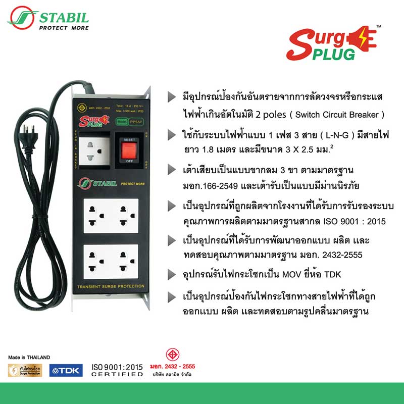 เป็นอุปกรณ์ที่เหมาะสำหรับใช้ป้องกันไฟกระโชก ( Surge ) ที่เหนี่ยวนำเข้ามาทางสายไฟฟ้า โดยทำให้เกิดความปลอดภัยกับอุปกรณ์เครื่องใช้ไฟฟ้าอิเล็กทรอนิกส์ต่างๆ เช่น ชุดคอมพิวเตอร์ ชุดเครื่องเสียง ชุดโฮมเธียเตอร์ จอพลาสมา เครื่องมือสื่อสาร เครื่องมือทางการแพทย์ เป็นต้น โดย Surge Plug เสิร์จปลั๊ก นอกจากนี้ยังติดตั้งใช้งานง่ายในรูปแบบของ Plug & Play
