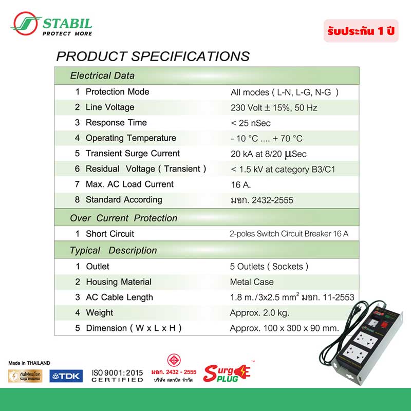 Surge Plug เสิร์จปลั๊ก model: PP5AF ปลั๊กกันไฟกระชาก มาตรฐาน มอก. 2432-2555 และมีคุณสมบัติความสามารถในการป้องกันไฟกระโชกแบบช่วงสั้น (Transient) ขนาด 20 kA ได้